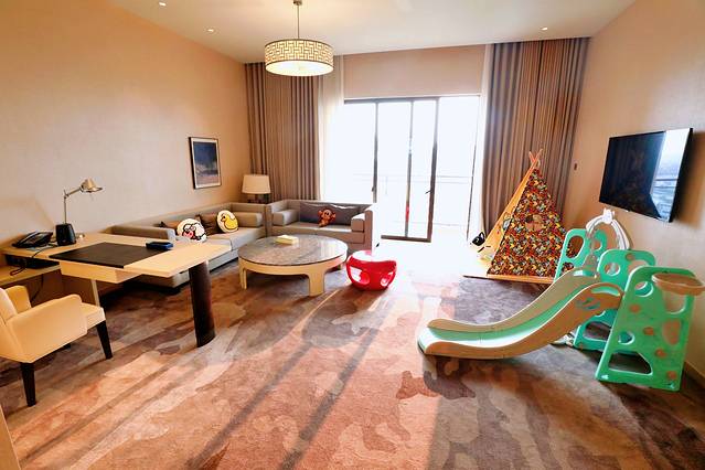 酒店在亲子方面准备也很到位,特别适合溜娃党。客房有专门的亲子房:贝肯熊主题亲子房和小黄鸭亲子套房。两娃自己选的小黄鸭,性价比很高,明亮的橙黄色给人一种很热情、兴奋的感觉,特别适合活泼的小朋友。