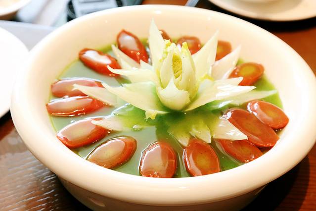 养生菜汁甘笋,以其独特又漂亮的外观一下吸引了孩子的注意。菜汁是菠菜汁,非常爽滑,甘笋即胡萝卜,是水晶萝卜,比普通萝卜口感较好。即使是素菜,小孩子也很喜欢。
