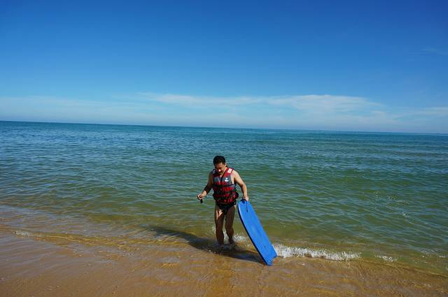 日月湾在神舟半岛去往蜈支洲岛的路上,因为蜈支洲岛玩了一整天,日月湾冲浪只好安排在今天了,又是泡海的一天。酒店出发到日月湾冲浪俱乐部只有25公里,睡到自然醒,再享用酒店丰富的早餐,结果到这里的时候阳光毒辣,好在我们这些糙男人也不怕晒。