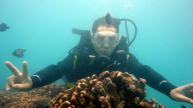 本来我还总把“蜈”支洲岛和“蜈蚣”联系起来,以为就算不是岛上到处爬满蜈蚣,起码岛的形状也像只“蜈蚣”吧。结果看到地图才发现,“蜈支洲岛,坐落在三亚市北部的陵水湾内,距海岸线二点七公里,方园约一点五平方公里,呈不规则的蝴蝶状。”