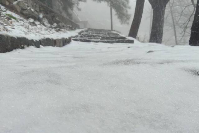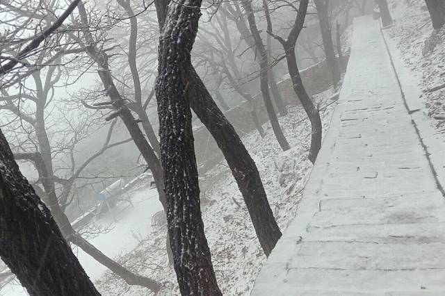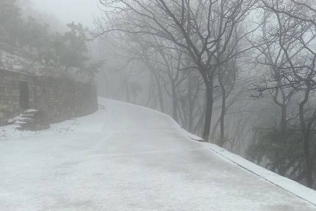因气温较低,前一日起海拔1156米的龟蒙顶便飘起了雪花,本以为是昙花一现的春日美景,谁曾想到龟蒙顶竟下起了鹅!毛!大!雪!整个蒙山之巅似白纱覆盖,惊现“山下群花争艳,山顶大雪纷飞”景观。
