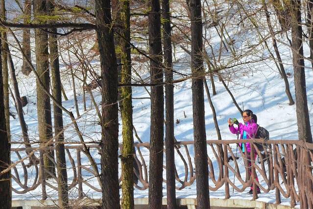 微风吹过,雪花漫天飞舞,蒙山宛如进入了一个银白色的童话世界,银装素裹,分外妖娆,美如画卷,令人倾醉。参天的大树,茂密的树林,远眺的山头,寻味的路径。那枝头上压着不少的雪,偶尔斑驳的阳光穿透过树枝,犹如我们遇见一个叫“蒙山”的性感姑娘。