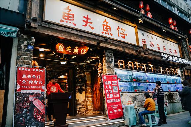 在鸳鸯楼拍完照之后,很快就到了饭点了。之前看过攻略,就在某评价网上有种草到这家鱼夫鱼仔鹅卵石鱼火锅。我们都很好奇鹅卵石鱼火锅是个什么样子的火锅,看了看地图,致民路离我们所在的鸳鸯楼也就2公里,打车过去几分钟就到了。