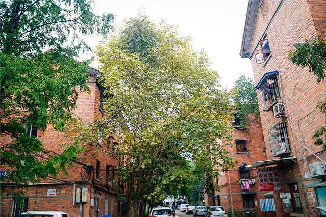 悠闲的老人,红色的低矮砖房,苍天的梧桐。走过树荫,院子一角的6层老居民楼更让人真切地置身于当年的生活场景之中。因为这里两楼之间设有两个交叉的“之”字楼梯,被人称为“鸳鸯楼”