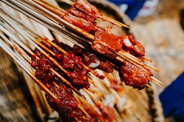 看看这串串,肉也太多了。而且店里面的肉串串还是提前腌制过的,很用心,上面还有满满的辣椒颗粒,一看就很有味道,我拿了很多嘎嘎。