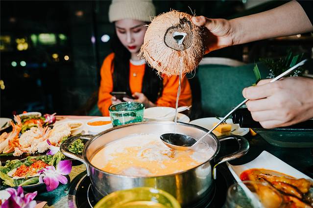 冬阴功汤底不仅浓郁,上来的时候服务员还会加上新鲜椰汁混合汤底,极大提高了锅底的新鲜味道!看着新鲜椰汁倒进锅底的时候总感觉就是坐在泰国用餐一样。