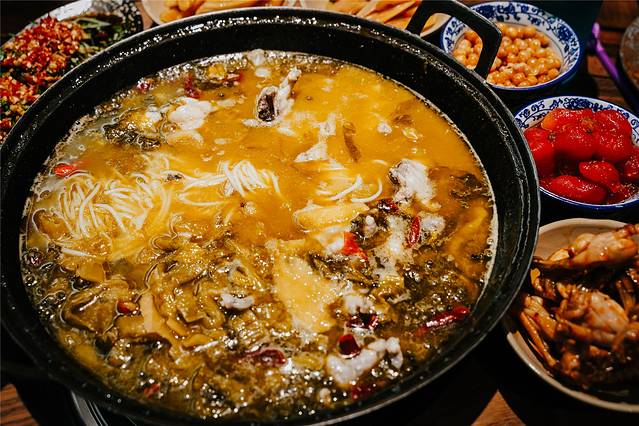 原来鹅卵石火锅就是锅底下铺了一层鹅卵石,阿姨加上锅底的时间太快了, 我没来得及拍下鹅卵石锅底的照片,不过看着这一锅暖暖的金黄色酸菜锅,就已经让人食指大动了!