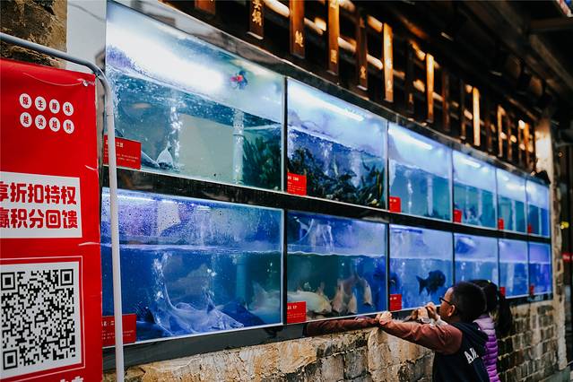 还没进到店里就被店门口一排的鱼缸吸引住了,里面都是新鲜游动的各种鱼类,看起来超级好玩。也很新鲜。