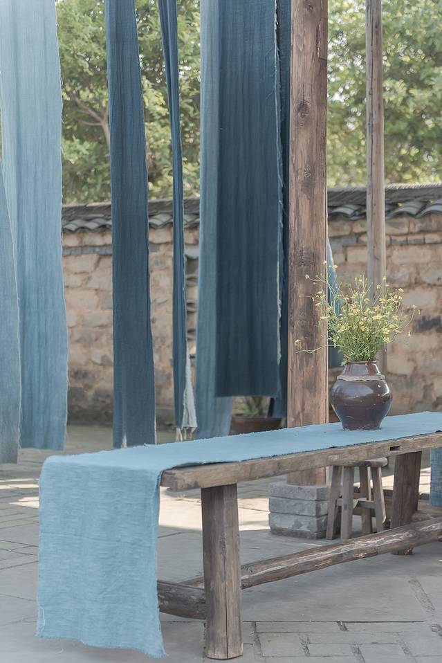 在岚染工房,有各式各样的蓝染,草木染的成品,有服饰,门帘窗帘,还有丝巾,床上用品等。