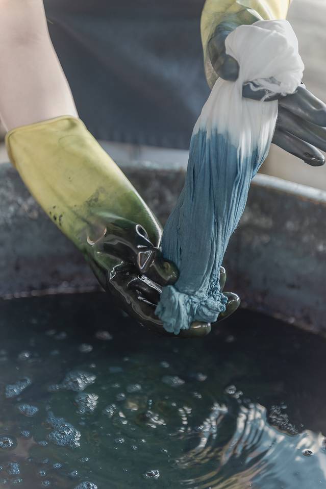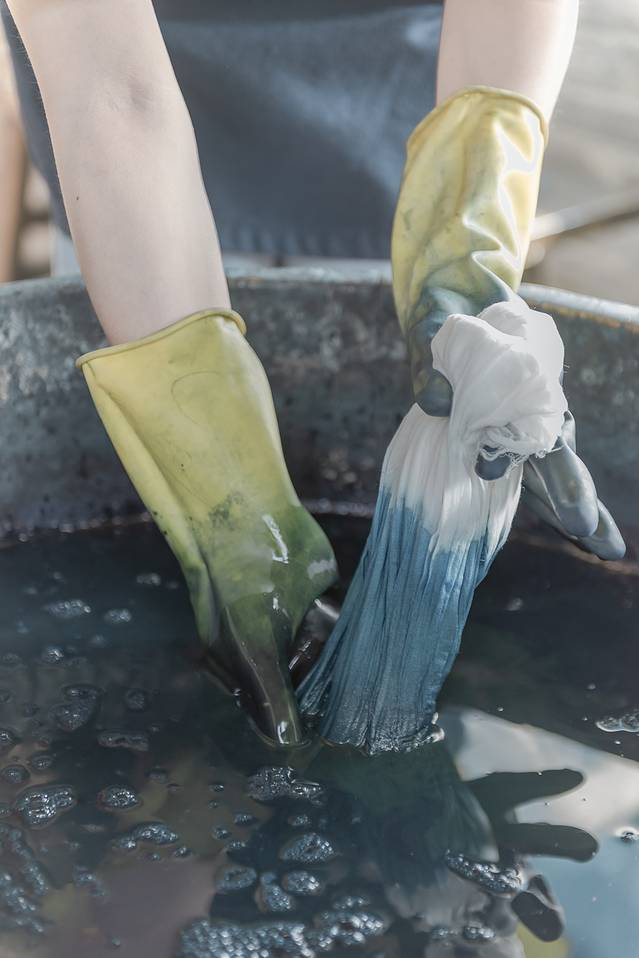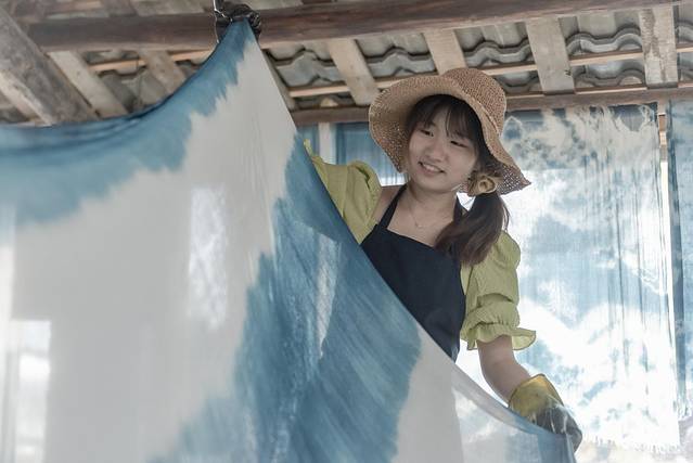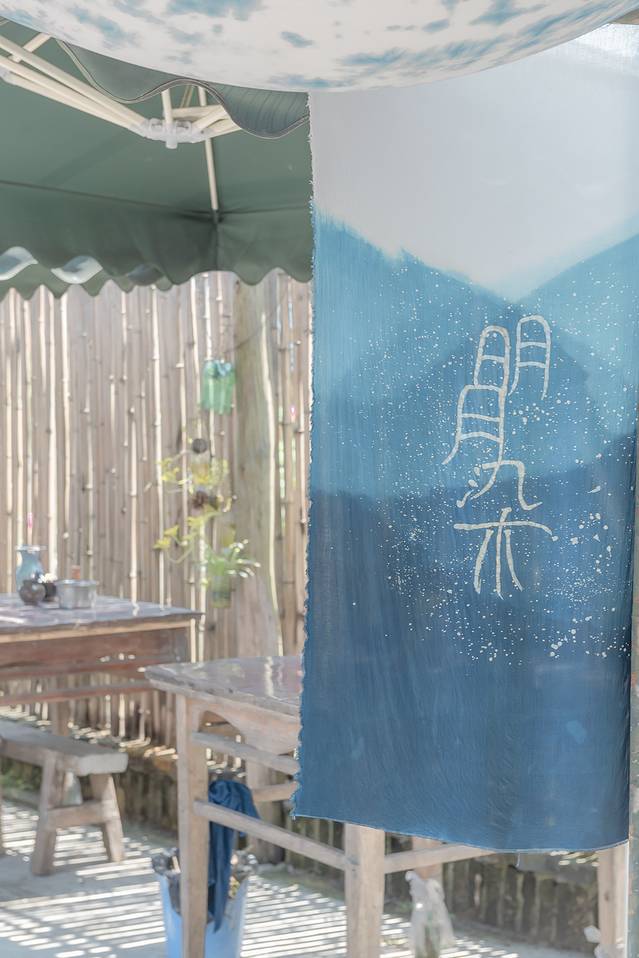 明月村的蓝染盛名在外,是一定不能错过,甚至会让人上瘾的“游戏”——把扎紧的纯白布料浸入颜色深重的染缸里,通过持续不断的充分按摩,让染料入侵布料的每一丝空间,再以氧化的力量,将其着上独一无二的蓝色。