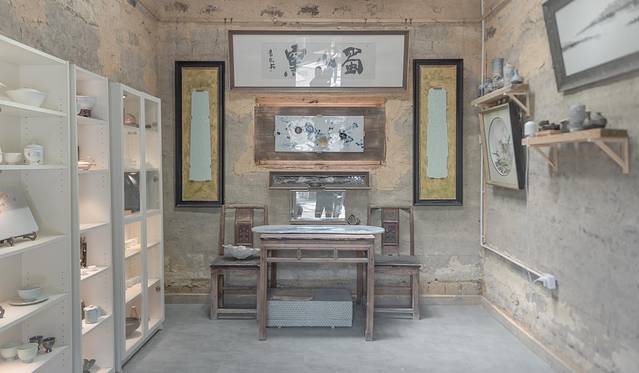 “蜀山小筑”的木栅栏小门,把这个手工艺坊和外面的熙熙攘攘隔离开来。院子内,几块石板把人们引向几间老屋,屋内陈列着些许设计简洁,工艺精湛的陶瓷器具,旁边的玻璃房顶之下,则是以“活着的博物馆”为主题的蜀山窑陶瓷艺术博物馆。