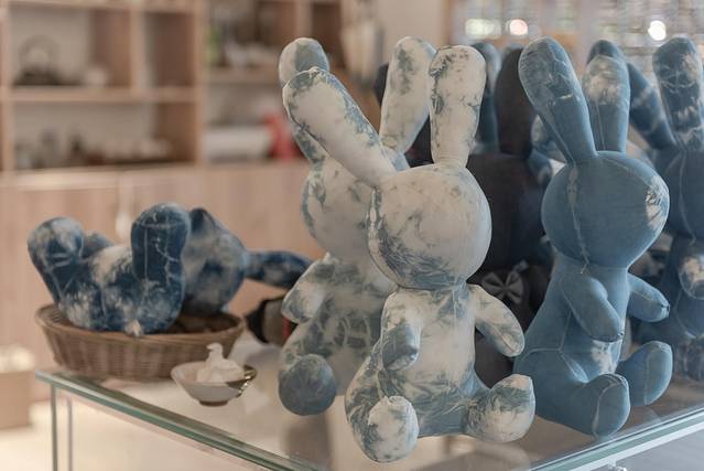如今,蓝染已经不再仅仅只停留在方寸布料之间,更是被制成了各式各样小玩意儿,从基础的服饰,到背包挂饰玩具,也从单纯的“蓝”,走向了“五彩斑斓”,对于传统文化,更好地散播四方,也不失为一种继承。