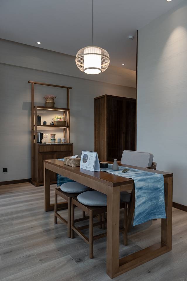 沿着小桥流水进入其中,静谧安逸,脚步都变得静悄悄,紧邻茶园的房间内,点缀着明月村的惊喜:蓝染的工艺品、精巧的陶瓷器具、无处不在的竹艺,都让人在精致中读出质朴。