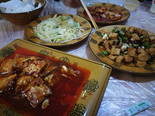 剑门豆腐宴,还是值得一试。我吃了怀胎豆腐(夹肉末)、宫爆豆腐、熊掌豆腐(双面煎)、麻婆豆腐,恩,川人的吃食,巴适嘞很。