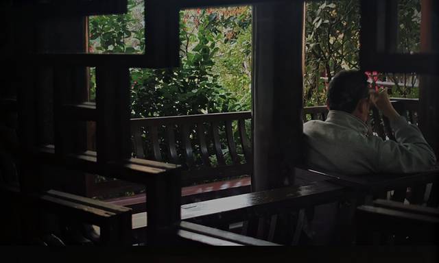 将桌椅融于树影婆娑,簌簌响声隐约在耳畔