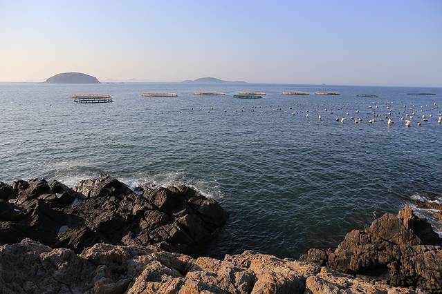 1430,玩好了过水屿可以沿着旁边的木栈道往避风港走,两旁鲜花盛开,蓝色大海里点缀着许多美丽的圆环状(大黄鱼)养殖场,吹吹海风,真是很美好的享受。