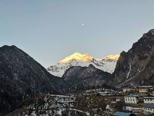 通过远眺日照金山,这景象是很壮观,一颗星静静地点亮在雪山上空,有点迷人…