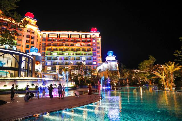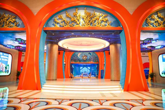 海豚湾 酒店以五彩斑斓梦话童话世界为主题,酒店随处可见充满童趣的海洋元素,大堂的大型水族馆非常值得打卡,小朋友一定会开心不已,酒店的海洋大世界大家还可以和海豚近距离接触,可以乘坐酒店内的摆渡车到寒武纪化石博物馆了解生命的起源。