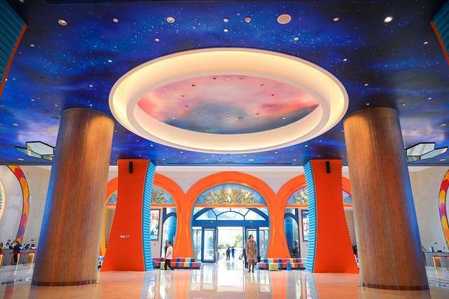 在去酒店的路上,远远的就可以看到彩色的酒店,充满了活泼的色彩。抵达酒店大堂一眼就可以看到酒店门口的两个代表酒店形象的玩偶,大堂内还有小丑在表演杂耍。整个大堂的风格也是五彩缤纷充满童趣的,让人对接下来的体验都充满了期待。