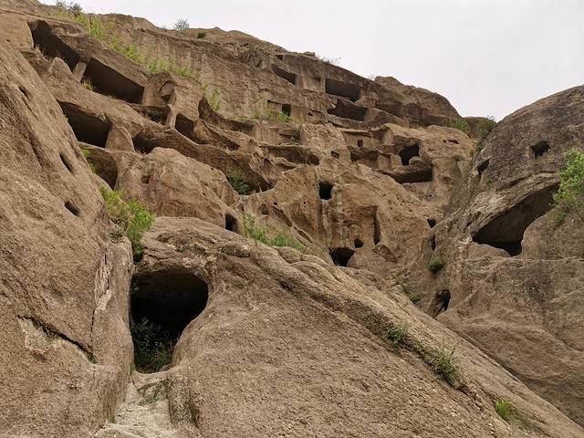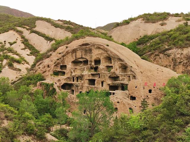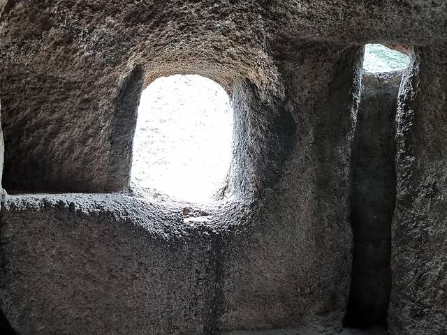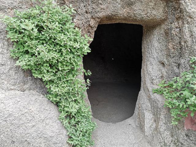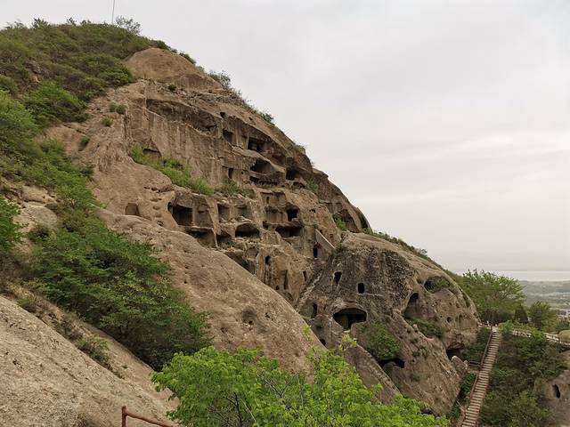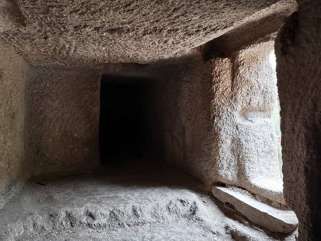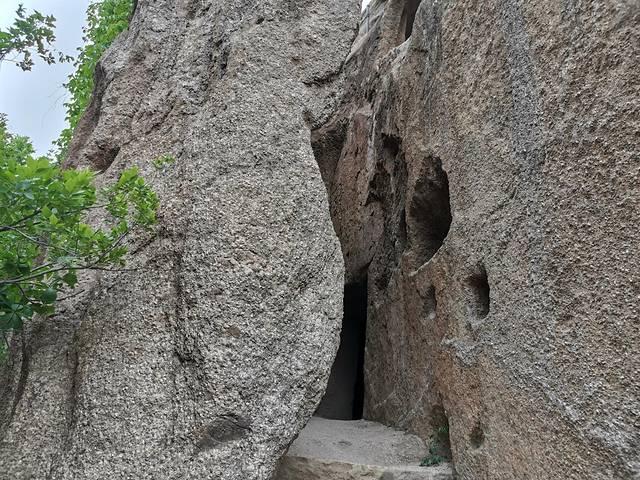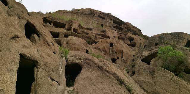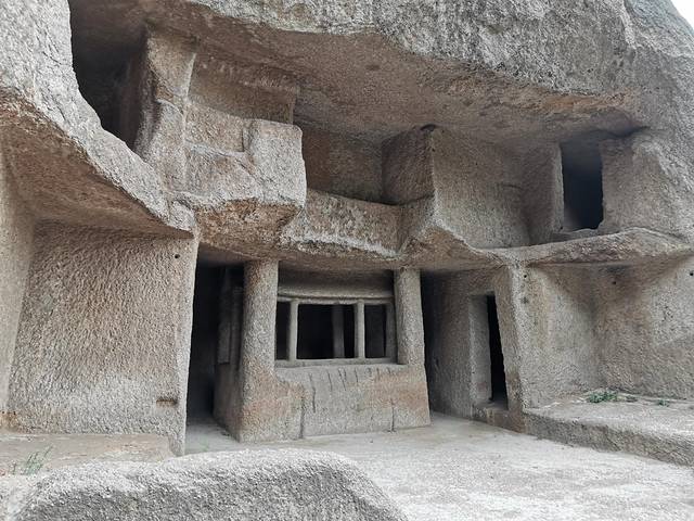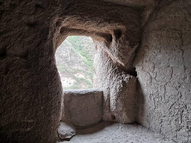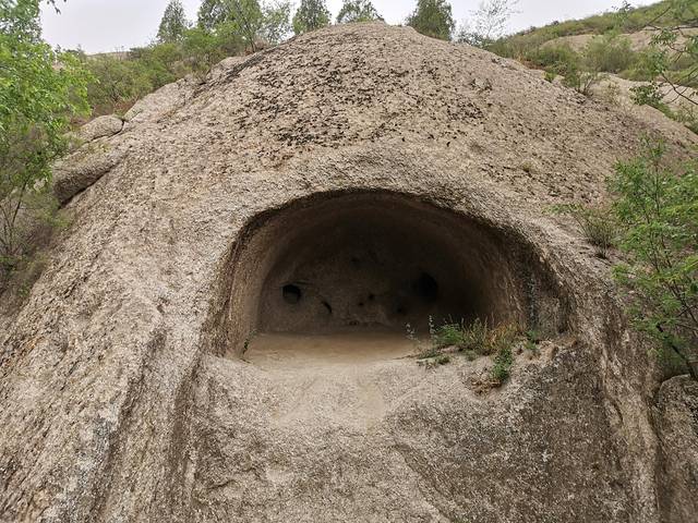 这里是古代人在陡峭的山崖上凿建的居所。在峡谷中一条不到10米宽的山沟两侧,距离谷底近10万平方米的陡峭花岗岩石壁上,遍布着人工凿刻的大小不同的石室。