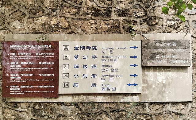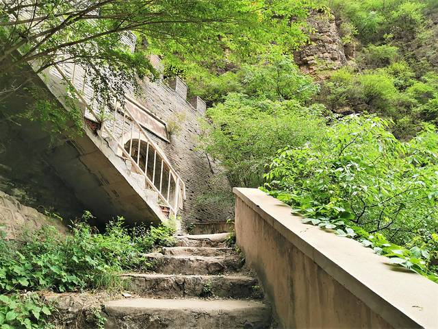 从山洞出来,到到游船码头,服务站旁边的石阶是通往神仙院景区的登山步道,如果不坐索道就从这里开始登山。
