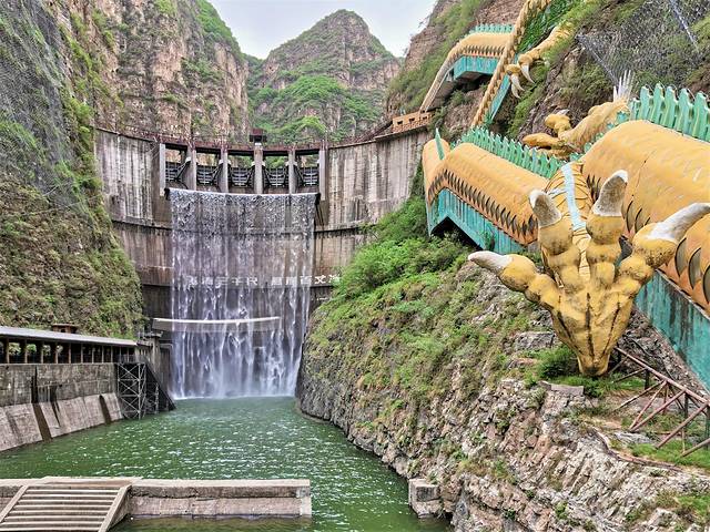 大坝前一条巨龙呈现在我们的眼前,它须爪飞扬、头下尾上的悬挂在千刃峭壁之上,这就是亚洲第一、创造了吉尼斯世界记录的腾龙电梯。这部电梯外观全部采用玻璃钢制成,全长258米,提升高度90米,内部分为六个梯段。