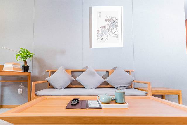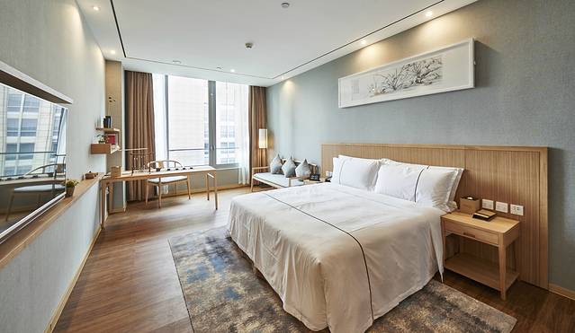 酒店是新中式的装修风格,随处都能看到工笔细描的花鸟国画和胡桃木中式家具,中式韵味十足。