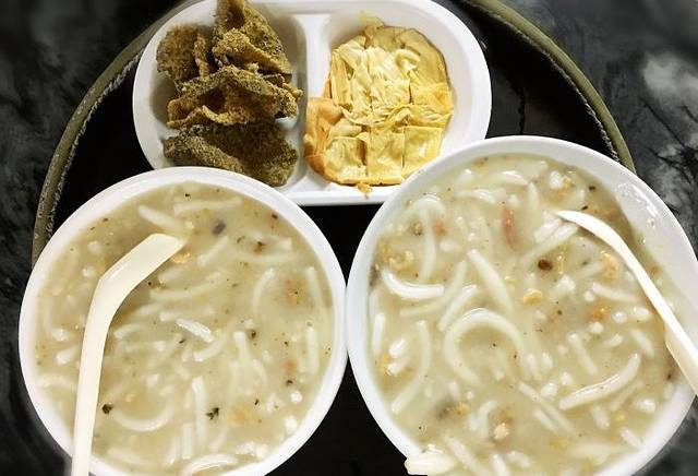 我们去的第一家是位于多宝路广医附三医院对面的新联肠粉店,这家店只有早上才开,从店铺装潢和复古的号码牌就可以看出这是家老字号,我们点了两份大份肠粉(错误示范,小份完全足够)我还点了一碗最贵的猪杂粥(不记得粥名了)。