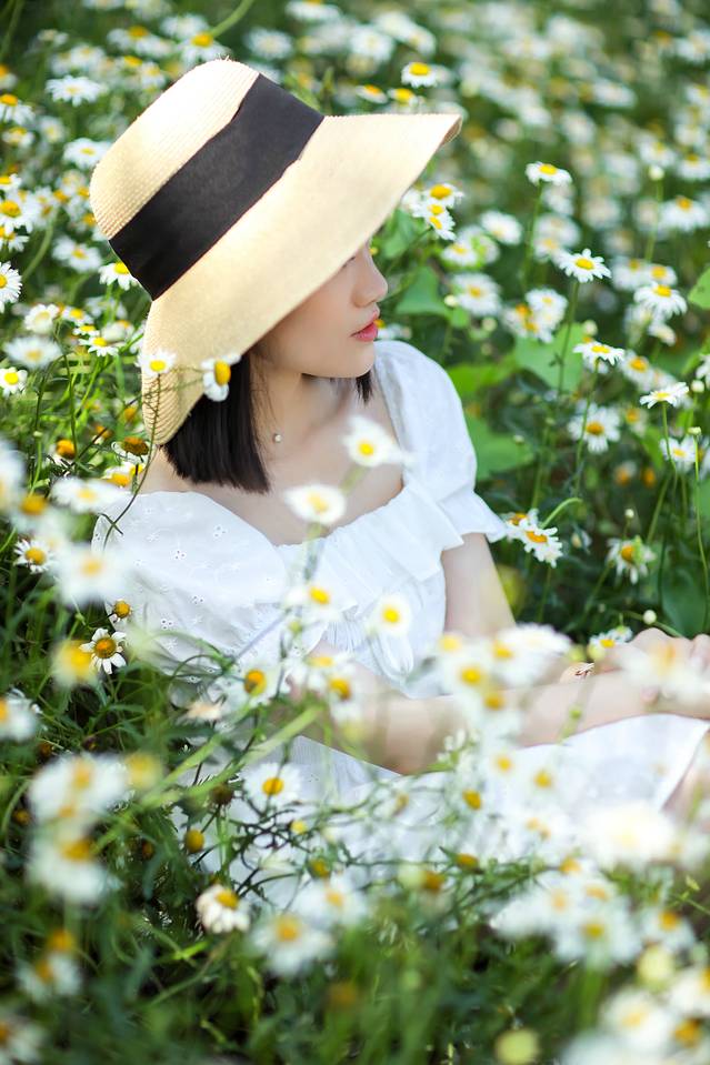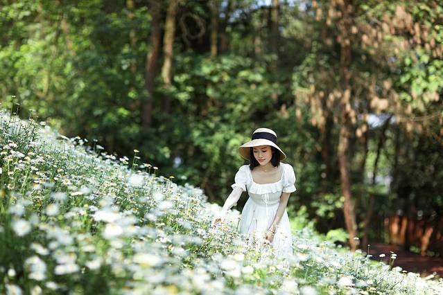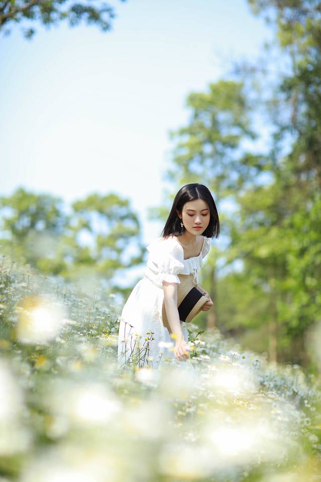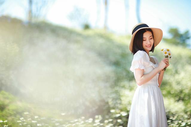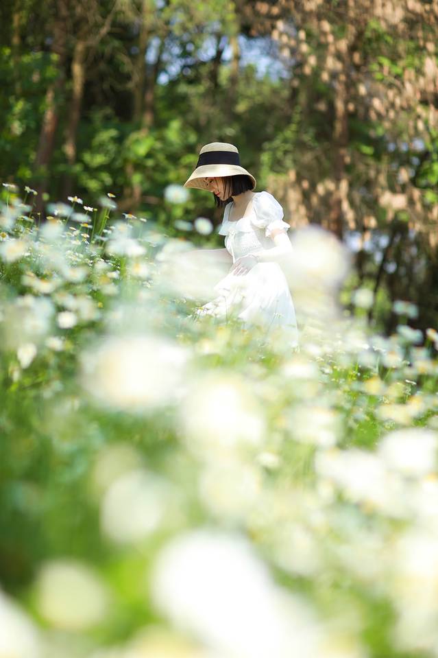 夏天拍花花都是清爽的颜色最佳,白色连衣裙或者淡黄淡蓝等马卡龙色系的衣服都可以,有条件的妹子可以带张蕾丝布坐起拍~