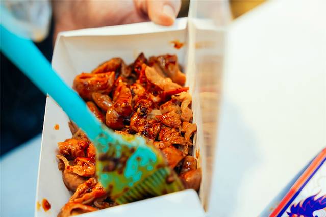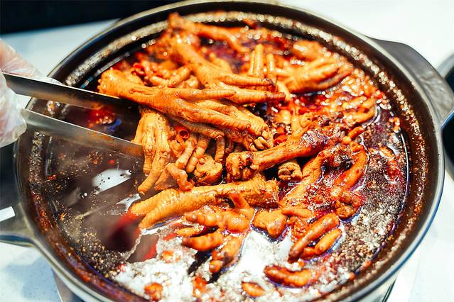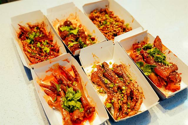 没等多久就卤好了,速度还是很快的。店员给装了盒子,还有筷子和一次性手套在里面。打开吃的时候还热乎乎,鸡爪很耙很糯。从锅里捞出来,撒一点作料,