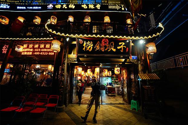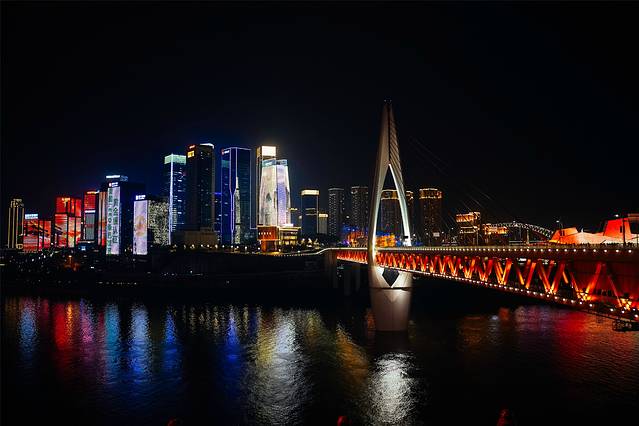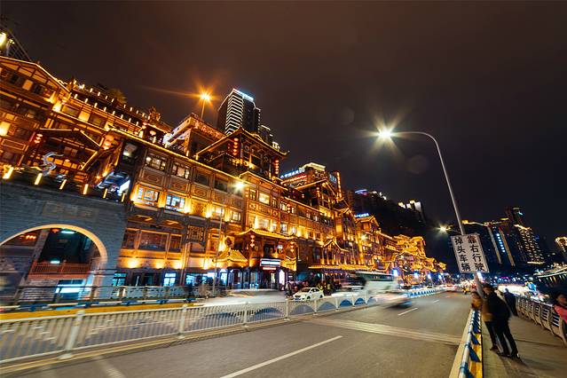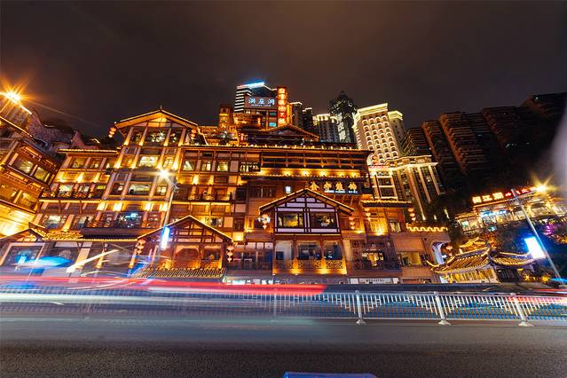 站在嘉陵江的对岸拍洪崖洞,可以连着嘉陵江把灯火通明的洪崖洞一起收入画面中。