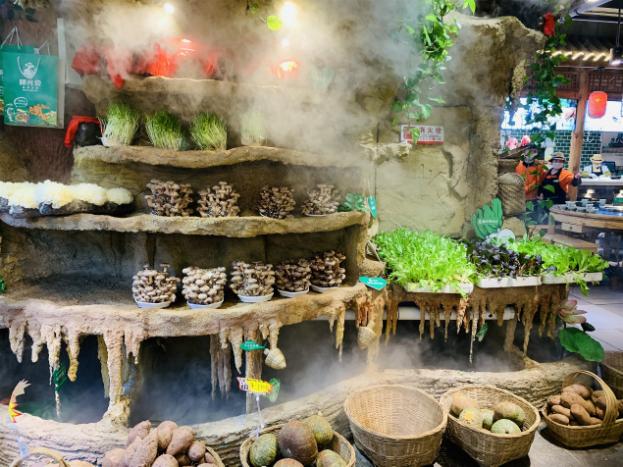 这家火锅店是一家主打鲜货的火锅店,店里面的食材都是百分百新鲜的,店铺一共分为上下两层,一进门右手边就是一个巨大的“菜市场”上面摆满了新鲜的蘑菇,生菜,还有金针菇,竟然还有服务员阿姨在上面采摘新鲜的菜哎,可以说是特别的有新意了🉑