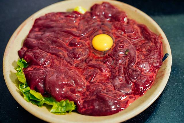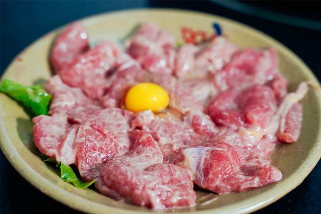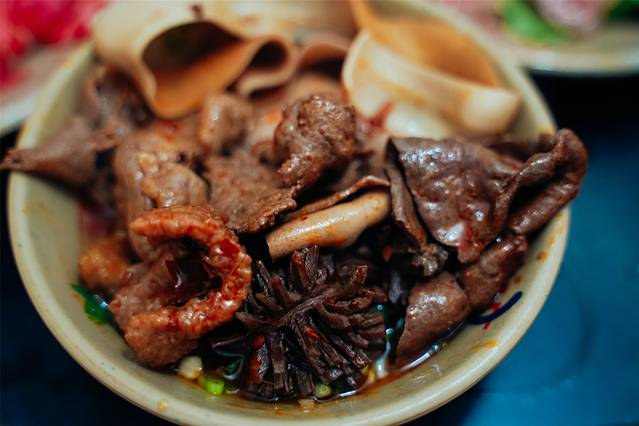 「嫩牛肉」我觉得是这次的最佳。牛肉经过处理,裹上了嫩肉粉,最上面还打上了一个鹌鹑蛋,煮之前把蛋搅开,每片肉都裹上蛋液再煮。