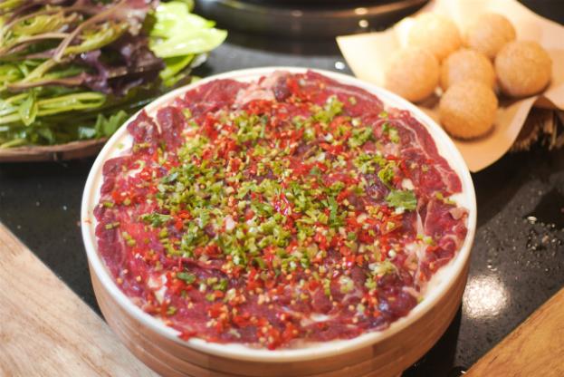 这个牛肉看着有没有让你们想流口水呀,我不管,他们家的这个牛肉是我吃到过的火锅当中最好吃的牛肉,不愧是他们家的招牌必点菜,牛肉肉质特别的细嫩,而且这个牛肉的表面都是满满的剁椒和小葱,再加上我们点的麻辣锅,下锅以后双重辣椒,配上他们家的独特的蘸料,哇,想想一下隔壁还没上菜的小姐姐的口水