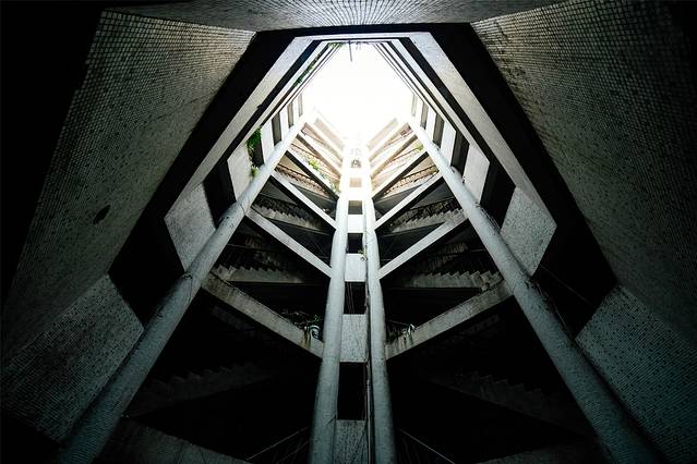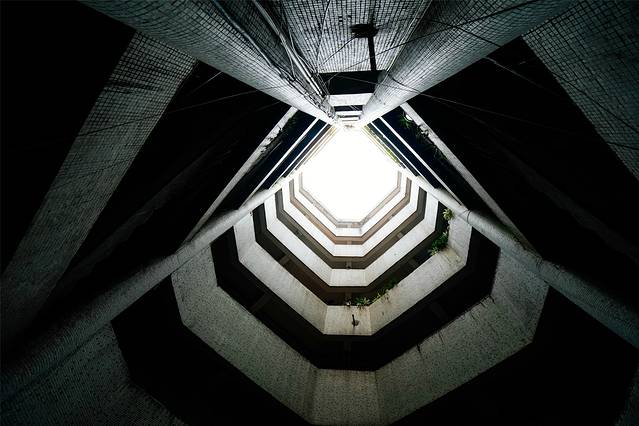 形状直线在画面里面被巧妙运用,随意构思也会有好图片,稍微调整一下光影,色调转换成黑白~八边形天井配着楼梯的直线。绝对就是好看的图。