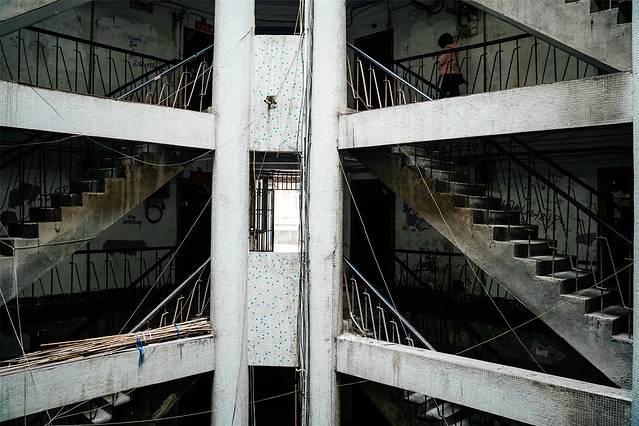 这座是有多年历史的老楼,八边形天井和纵横交错的楼梯,有种科幻感,在电影开拍之前就有很多游客、市民来这里打卡拍照。这两栋筒子楼看外表觉得与其他居民楼一样并无什么特别的地方,但是只要穿过幽静的通道,就会完全不一样~