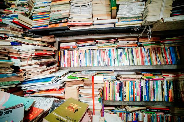 独特的“凌乱”风格惹人瞩目。从地板到天花板,堆满一层又一层旧书,这边有各种旧书杂志连环画,书的纸张泛着岁月的痕迹。