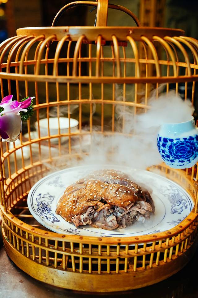 造型好酷!精致的鸟笼作为装饰,上了这个笼子就感觉高级很多。干冰带来的仙气飘飘,可以说一开始就征服了大家的眼睛,然后,我们才开始品尝美食。卤鹅卤得很入味,每一块切的很均匀。表皮的芝麻香气十分明显。鹅肉不同于鸭肉,口感更佳紧实。嚼劲也好一点。卤味恰好,不咸不淡,不会那么容易厌。