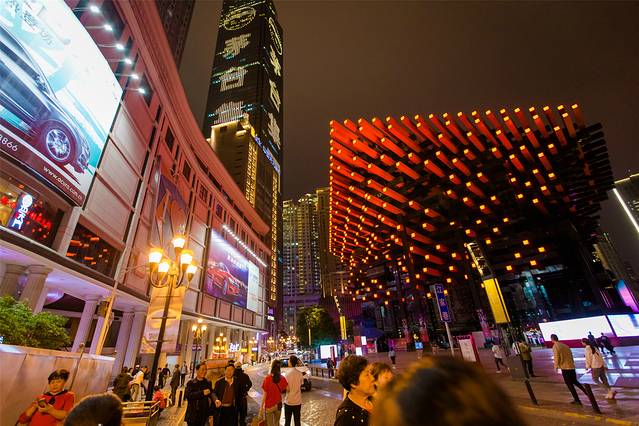 坐轻轨的话,可乘坐轻轨2号线,从C出口出站,出站后就是解放碑了。洪崖洞离解放碑也真的是很近。我们放了行李后就来这边闲逛了。