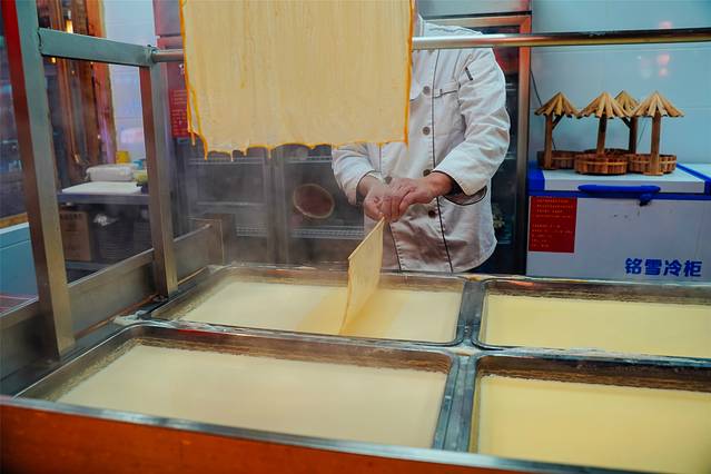 这张图是师傅在做豆皮,豆皮用来夹黄瓜的~豆皮裹上黄瓜,配上蘸料,清香,一点也不腻。