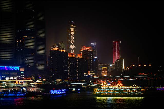 作为一个码头城市,江河是重庆的脉搏。涌动的长江水与嘉陵江水激流撞击,清浊分明,形成水花四溅的“夹马水”。不过朝天门这边还是夜景比较好看。川流不息的车辆,游轮载着游客在江水中穿梭。字水霄灯也是巴渝十二景之一,夜晚的朝天门自古以来就有着盛名。白天江面船帆林立,舟楫穿梭,码头密布人行密布。如果白天更多的是忙碌,那夜晚更多的是灯火辉煌,闲暇赏景。