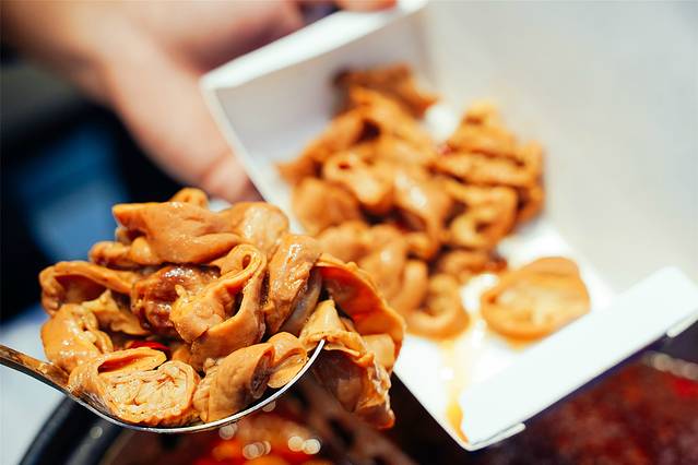 「肥肠」切成非常小块,刷上他们的蘸酱,吃不出腥味!还好还好~