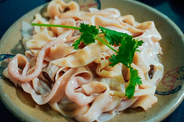 鸭肠最长的一根差不多有半米,脆而化渣,底下的冰块保护住它的新鲜爽脆。