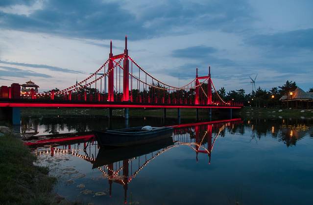 好运桥临水而建,位于香海·森林公园附近。夜幕降临,在好运桥通体红色柔光照耀下,这里的一草一木也变得温柔起来。一边是森林氧吧,一边是微波荡漾,在如此静谧夜色中踱步桥上,养心怡情两相宜。