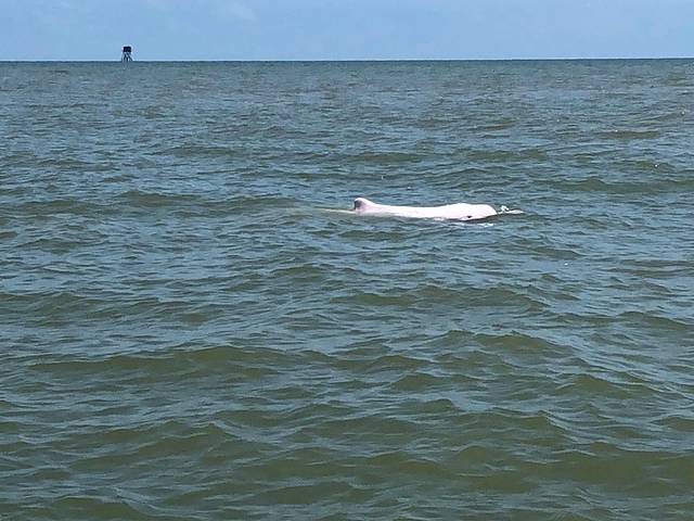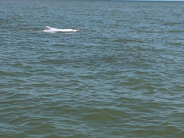 突然,远处有两只白色略带粉色的海豚跃出了水面,大家一番惊呼,船夫马上开动马达,直逼海豚。