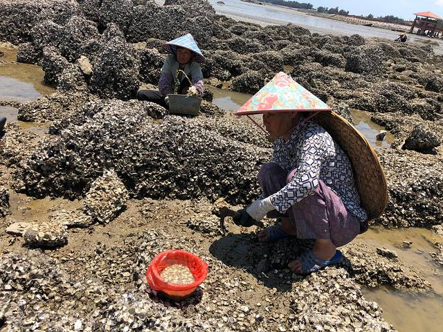 还有一条小路,可以到达私人搭游人出海看海豚的小码头,小路两边的岩石上布满了小小的贝类,有几个中年女人用工具刨贝肉。