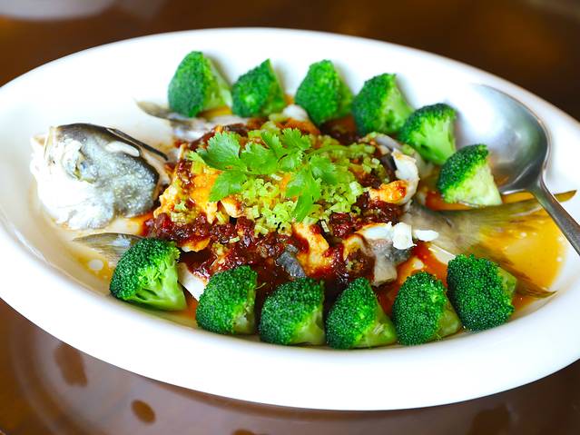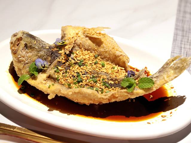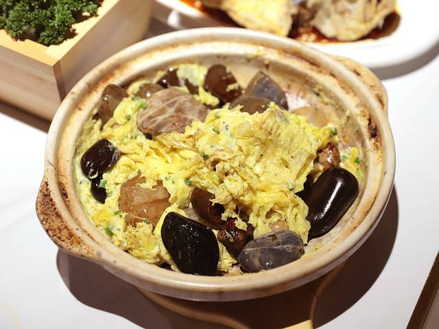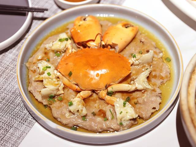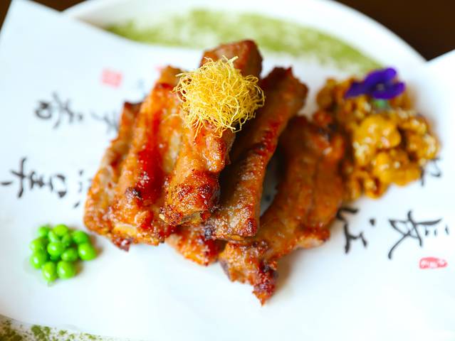 冰山樱桃肉:摆盘好看,肉块的色泽和大小如樱桃般,用碎末冰块装点着,口感外酥里嫩,和糖醋里脊的味道有点像,酸酸甜甜的,不过它吃起来凉凉的,很爽口。