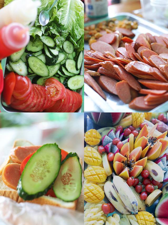 岛上提供自助午餐,因为不能生火,所以都是准备的速食之类的,面包片、各种蔬菜、酱料自制三明治,还有餐后的水果大餐,还是蛮丰盛的。大家围桌而坐,一起享用,管饱管够。