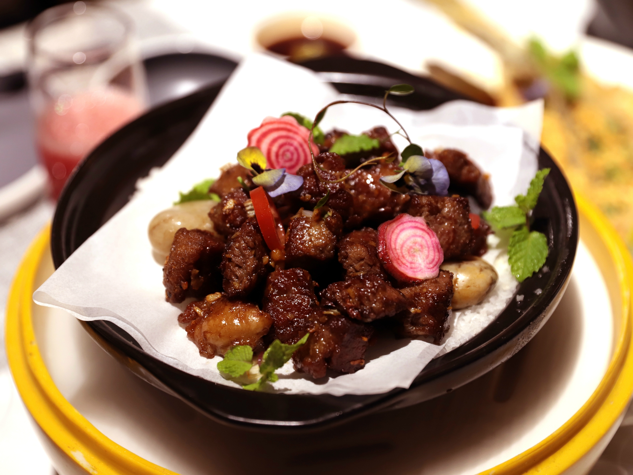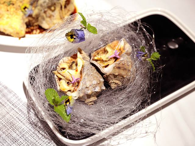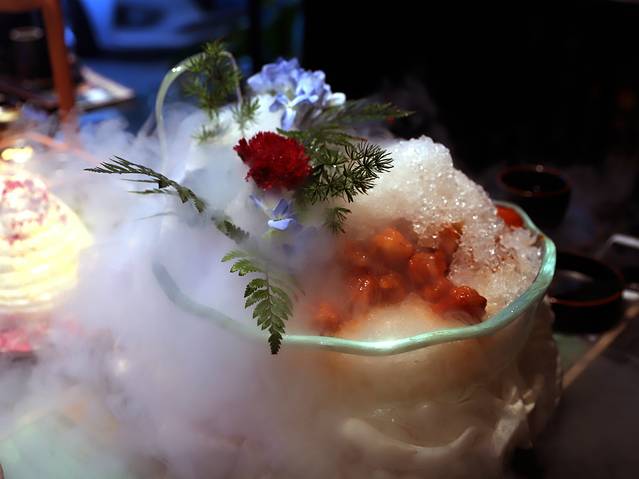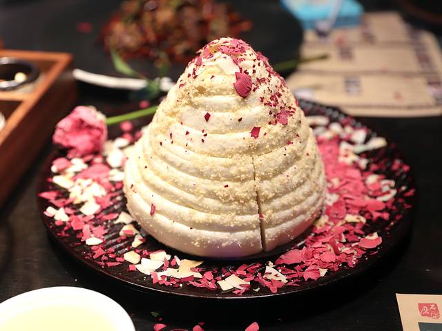 网红椰香花卷:有惊喜的一道菜,一束玫瑰花,经过干冰的淬炼,变成微干的花瓣,双手轻拍,就像仙女撒花般洒落在花卷上,瞬间颜值提升两倍。吃起来是淡淡的椰香味,搭配炼乳,吃起来甜甜的,有点小幸福。