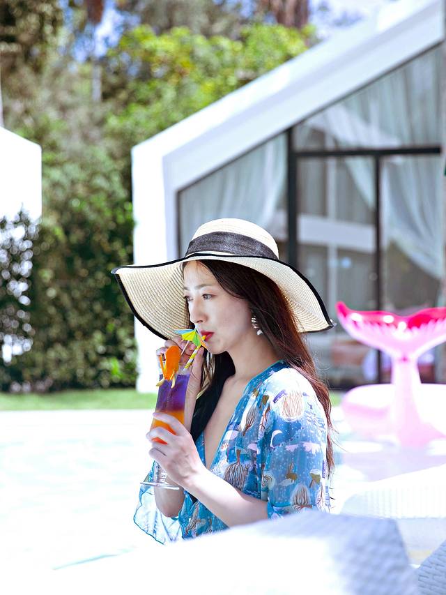 院落中间有一个超大的玻璃无边泳池,在这里拍照很出片的说,很多人都会选择在这里拍照。泳池中还摆放了火烈鸟、贝壳网红饰品,适合凹造型用。